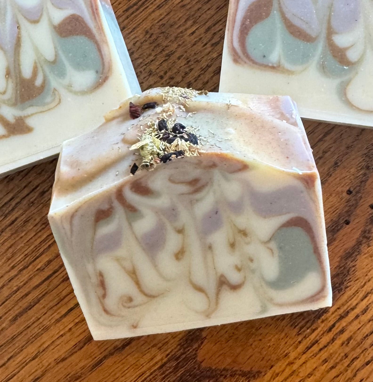 A blend of kaolin clay, French green clay, and French purple clay helps draw out impurities, while turmeric adds a warm golden tone. Each bar is naturally beautiful, featuring lovely swirls of earthy greens, soft purples, and golden hues — no artificial colorants, just plant and mineral color.